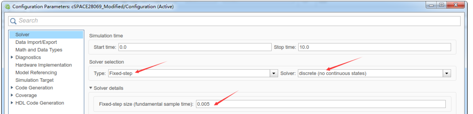 ⑩ 解算器设置:在建模界面点击“小齿轮”(Model Configuration parameters)可配置该仿真的解算器;对于嵌入式代码生成,只支持离散状态 Fixed step的解算器,其类型必须选择固定步长Fixed-step,解算器型号必须选择discrete,基本采样时间设置为 0.005s,这与芯片的执行周期匹配。