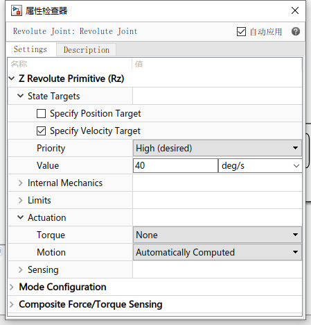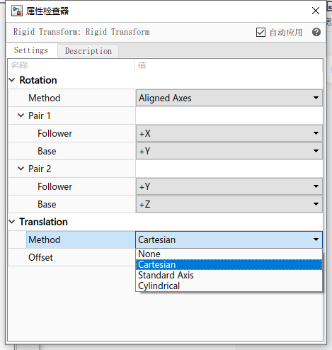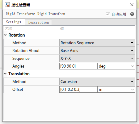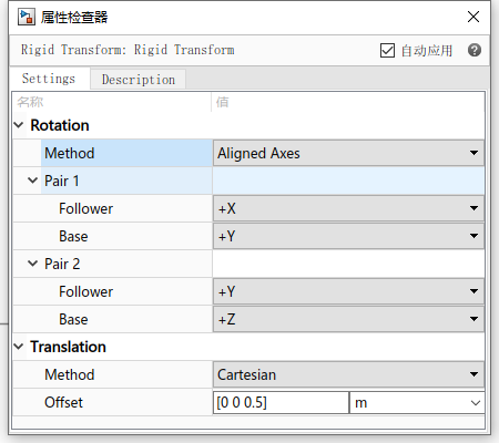 可以看出,在两个坐标系之间添加运动副后,F坐标系相对于B坐标系发生运动。使用Revolute的效果是F坐标系绕B坐标系的Z轴以一定转速转动。也可以给定一个初始角度: