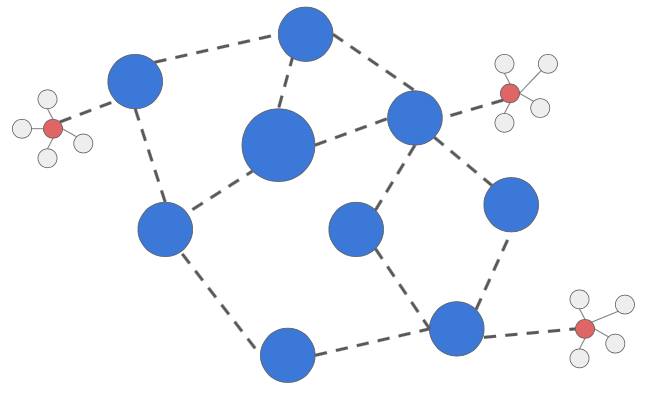 混合网格网络拓扑结构结合了星型和全Mesh两种策略。有几个星形网络,但它们的Coordinator可以作为网状网络进行通信。混合网络允许比星型拓扑更长距离的通信,比全Mesh拓扑更具有分层设计的能力。这种拓扑结构由EmberZNet PRO堆栈构成,使用路由器设备作为星型子网的Coordinator,其中每个集线器都可以有终端设备连接到它。
