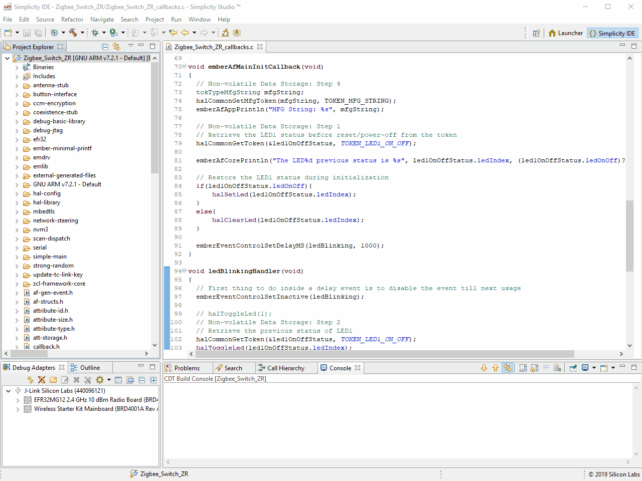 将必要的代码添加到项目后,请编译Zigbee_Switch_ZR项目,并将其烧录到BRD4162A开发板上。