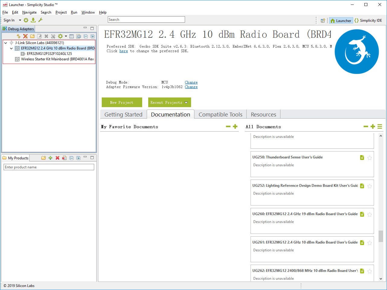 使用“ J-Link USB”连接器和开发套件中随附的USB电缆将开发板连接到PC。并将电源开关切换到“ AEM”位置。启动Simplicity Studio V4,它能识别所连接的设备,并将其列出在如下所示区域中。