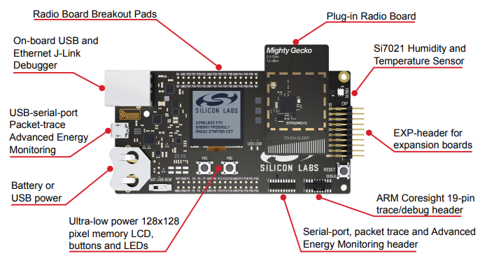 该实验需要EFR32MG21 / EFR32MG13 / EFR32MG12开发板中的任何一款,我们推荐使用EFR32MG12无线开发板BRD4162A,我们的示例项目也是基于该套件创建的。以下是该开发板的布局。