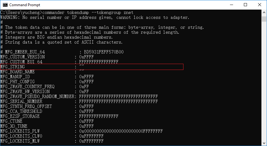 同样,您也可以使用Simplicity Commander来查看Manufacturing Tokens,如下所示。$ commander tokendump --tokengroup znet
