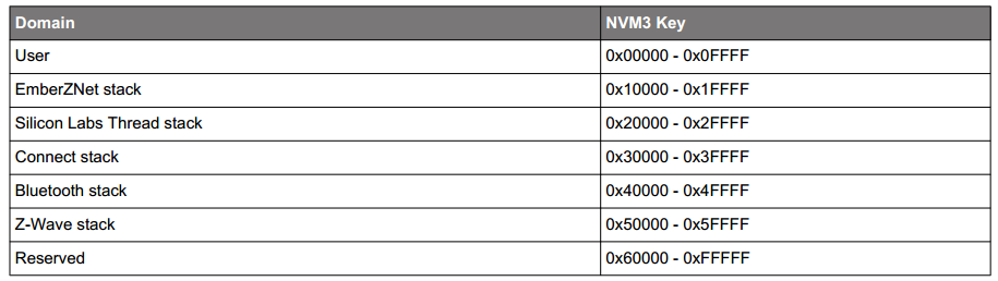 对于NVM3,自定义应用程序Token应使用NVM3KEY_DOMAIN_USER范围,以免与协议栈中的Token(例如NVM3KEY_DOMAIN_ZIGBEE)冲突。有关NVM3默认范围的信息,请参考下表。