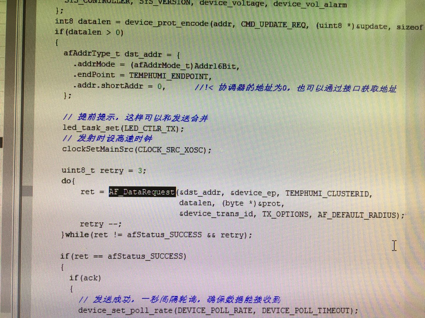 在AF_DataRequest函数返回值进行仿真,查看ret的结果值,无意间尝试,把协调器断电,设备发数据,理论上应该得到错误值,但是这个值确是0,我怀疑数据有没有发出去,通过抓包,发现
