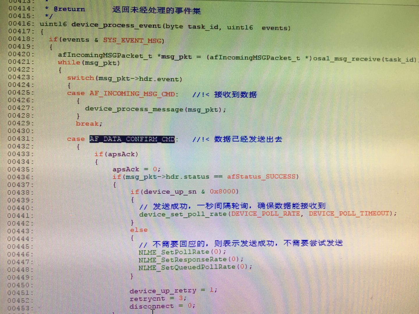 这里面才是有无收到ACK状态返回,断开网关,返回值在0xe9,信道繁忙,返回值是0xe1,定义在zcomdef.h定义,通过修改,解决了丢包率高的一系列问题,当然还有关联时间过长等问题,稍后分享