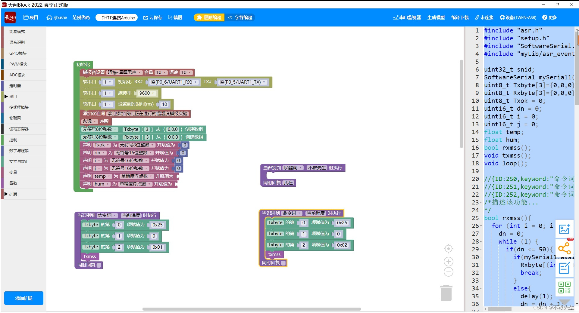 本程序通过DHT11获得当前温湿度,并通过串口通信与ASR01连接,然后由ASR01播报