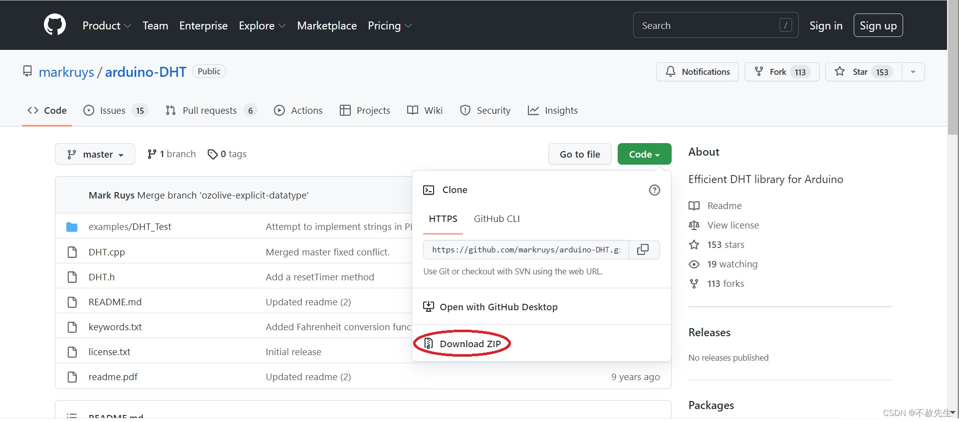 为简化程序的编写,Arduino端的程序调用了一个读取DHT11数据的简易库文件DHT.h,该库文件可以到网址:https://github.com/markruys/arduino-DHT下载,下载完全是免费的,也不需要进行注册登录等,打开网页后直接点击绿色的方块“Code”下拉,然后点击最后一项“Download ZIP”即可。网页界面见下图: