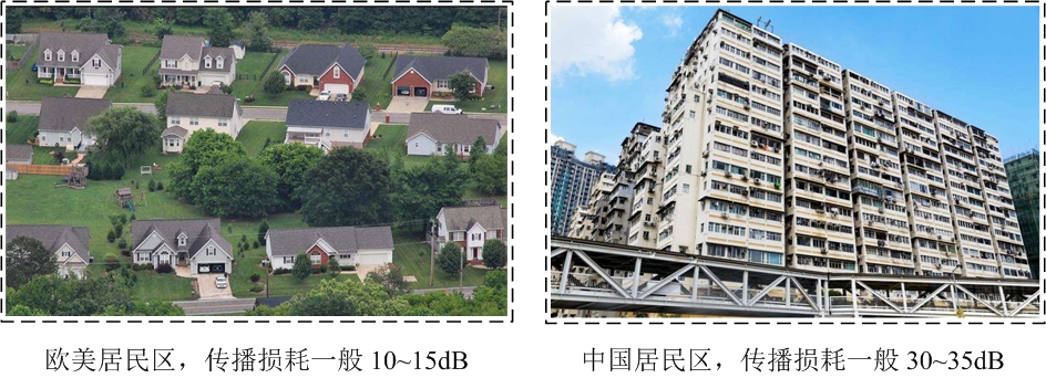 看完上图就明白原因了:欧美居民区,房屋低矮稀疏,传播损耗小;中国居民区,高层建筑多而密集,传播损耗大。二者的差异达到 20dB,这在通信距离上将相差 10 倍。