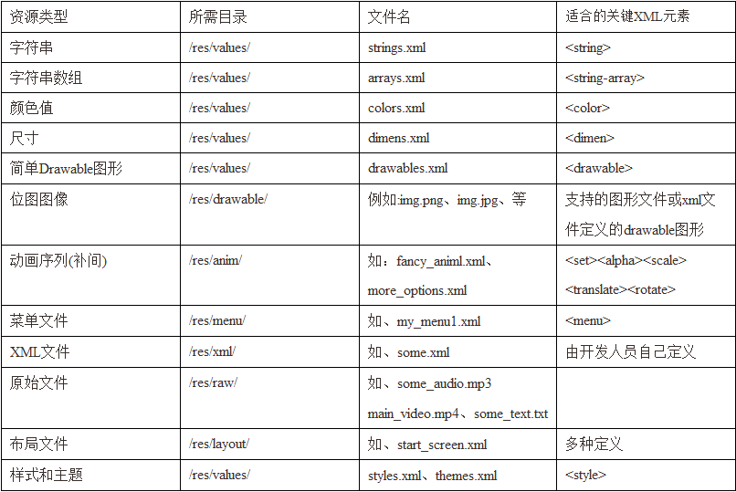 以上就是关于Android中的资源文件的存储和使用,在使用过程中注意不同的资源的使用方式。如果需要查看更多更详细的资源文件存储,请查阅Android官方文档,这里不再详述。