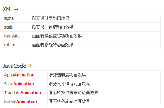 //在代码中定义动画实例对象 private Animation myAnimation_Alpha; private Animation myAnimation_Scale; private Animation myAnimation_Translate; private Animation myAnimation_Rotate; //根据各自的构造方法来初始化一个实例对象 myAnimation_Alpha=new AlphaAnimation(0.1f, 1.0f); myAnimation_Scale =new ScaleAnimation(0.0f, 1.4f, 0.0f, 1.4f, Animation.RELATIVE_TO_SELF, 0.5f, Animation.RELATIVE_TO_SELF, 0.5f); myAnimation_Translate=new TranslateAnimation(30.0f, -80.0f, 30.0f, 300.0f); myAnimation_Rotate=new RotateAnimation(0.0f, +350.0f, Animation.RELATIVE_TO_SELF,0.5f,Animation.RELATIVE_TO_SELF, 0.5f);