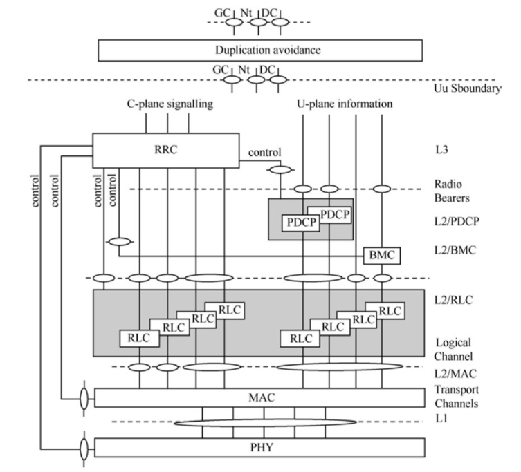 Uu 空中接口包括:L1(物理层)、L2(链路层)和L3(网络层):