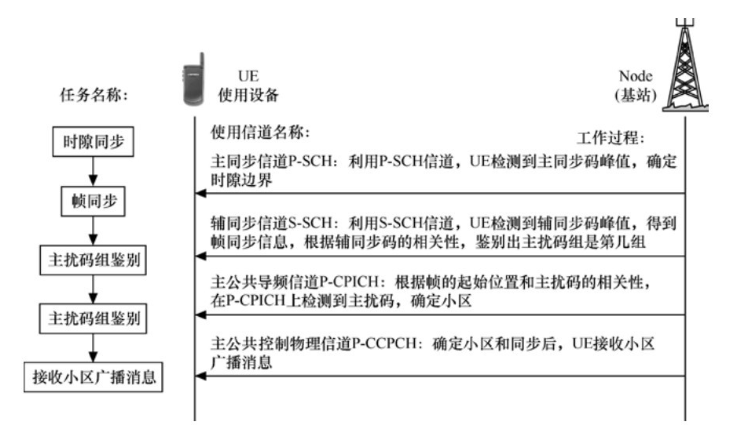 在小区搜索过程中,UE 将搜索小区并确定该小区的下行链路扰码和该小区的帧同步,小区搜索一般分为3步:时隙同步、帧同步和码组识别、扰码识别。