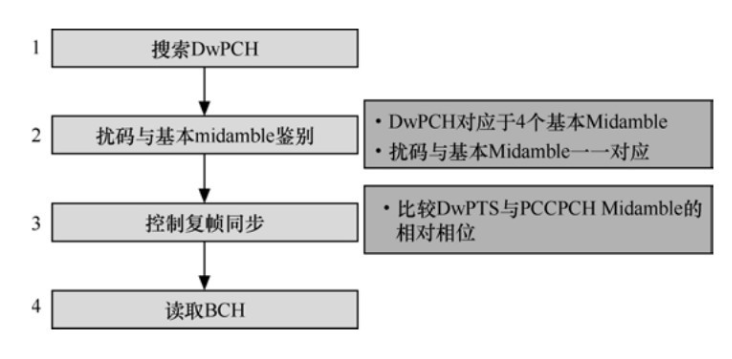 小区搜索利用DwPTS和BCH进行。在初始小区搜索中,UE搜索到一个小区,建立DwPTS同步,获得扰码和基本midamble码,控制复帧同步,然后读取BCH信息。