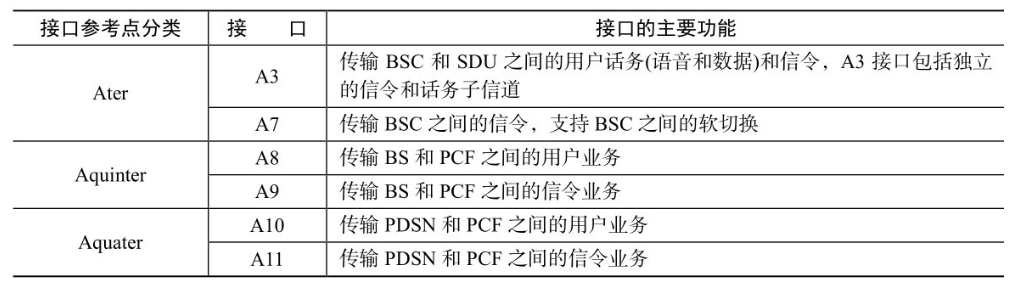 AT为接入终端,与IS-2000系统中的MS是同一个概念;AN为接入网络,包含BSC和BTS;AN-AAA 为接入网络侧的AAA服务器。主要接口参考点分为4类:A、Ater、Aquinter和Aquater。接口参考点的分类和功能具体如下: