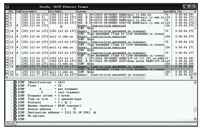 解:② 处前面 Protocol 意思是协议,协议就是 ICMP;③ 写源地址,就是第一行第一个地址 202.113.64.137;④ Destination address 意思是目的地址,这个位置应该写题中有的网址 mail.tj.edu.cn。