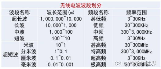 通常无线电波所指的是从极低频10KHz到极超高频的顶点30GHz,因为超出这个范围以外的无线电频谱,其特性便大有不同了,如光线、X射线等。而在上述10KHz到30GHz通常划分成七个区域,如图所示。