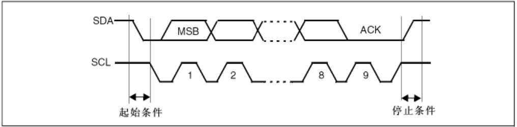 IIC总线通信时每个字节为8位长度,数据传送时,先发最高位后发最低位,发送器发完一个字节后接收器必须发送一位应答来回应,即一帧有9位。时钟线SCL为低电平期间,发送器向数据线上发送一位数据,在此期间数据线上的信号允许发生变化,时钟线SCL为高电平期间接收器从数据线上读取一位数据,在此期间数据线上的信号不允许发生变化。