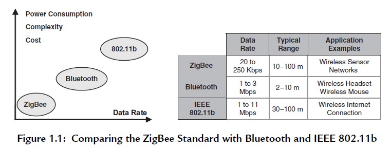 Zigbee是一个技术联盟,其目的是支持近距个人通信,即PAN(Personal Area Network)。一个简单的比方,现在大家可能都有手提电脑、手机、还有MP3之类的,这些设备之间通信可以看成一个PAN。从学术角度,IEEE802.15.4即是描述个人通信的规范,而遵从Zigbee的产品是完全与IEEE802.15.4兼容的。当然,日常提得比较多的是蓝牙和WIFI,也是一种近距通信技术,但是Zigbee强在其低功耗、低数据率,实际上Zigbee理论最高速率不超过250kb/s。下面这个图说明了问题: