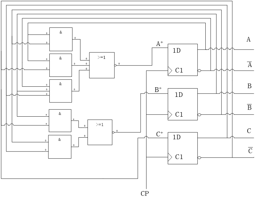 根据上面的分析,3位计数器需要用到3个状态寄存器。A+、B+、C+是状态寄存器的输入;A、B、C是状态寄存器的输出。由此可根据时序电路的一般模型可画出3位计数器的结构。