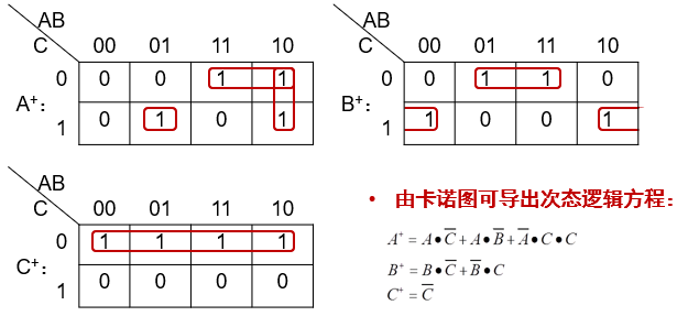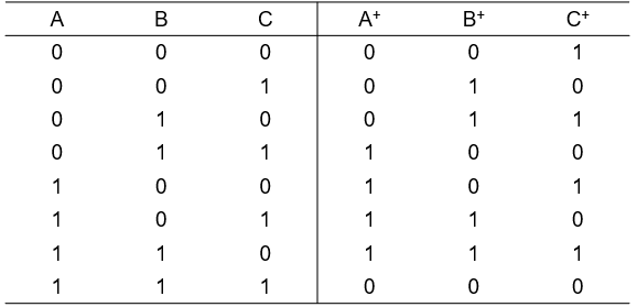 用A、B、C分别表示3个位,则A+、B+、C+表示A、B、C的次态。其真值表如下: