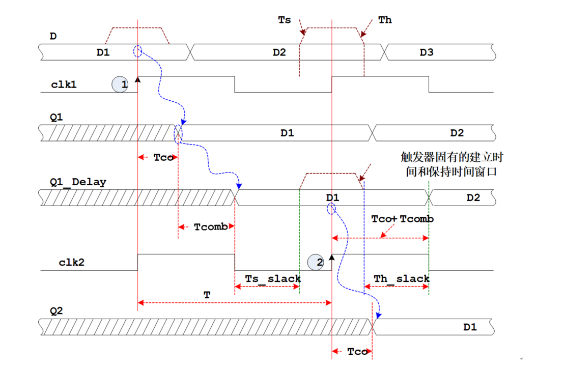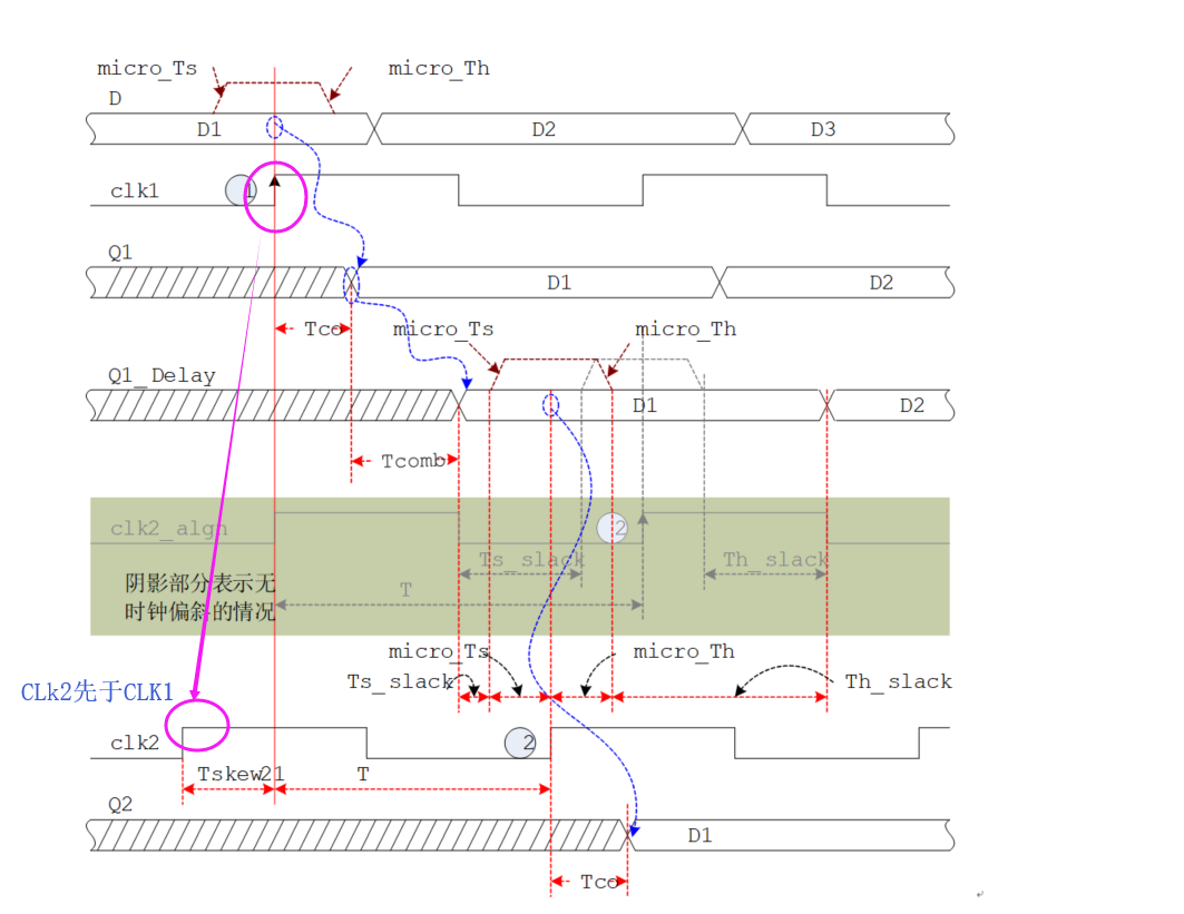 为由浅入深,假设 Skew = 0,即说明时钟到达所有器件的时间相同,没有差异,那么图中时钟上升沿1到时钟上升沿2之间刚好相隔一个工作周期T。下面介绍几种情况下的同步时序电路模型的时序图,图中标注了说明。