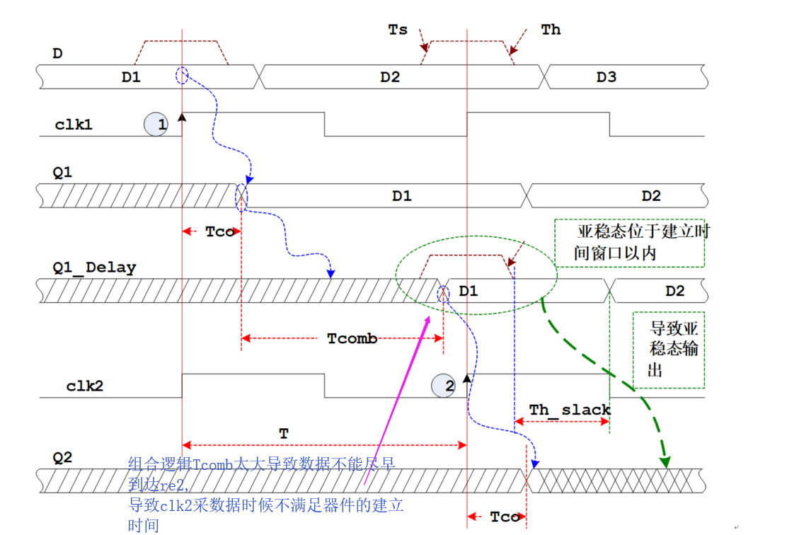 因此不会产生输出亚稳态现象。也可推出 (T-Tco-Tsu) > Tcomb > (Th-Tco) ,即对组合逻辑延迟的要求。