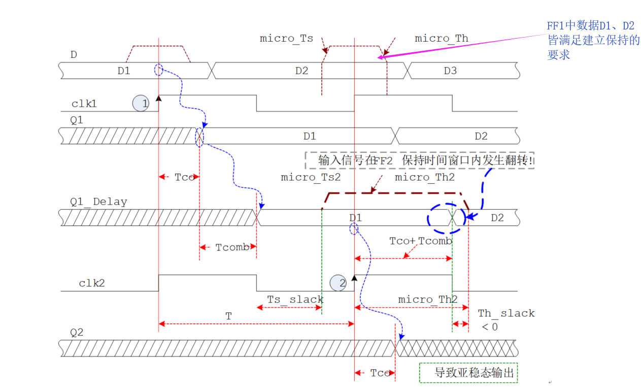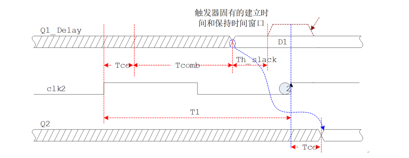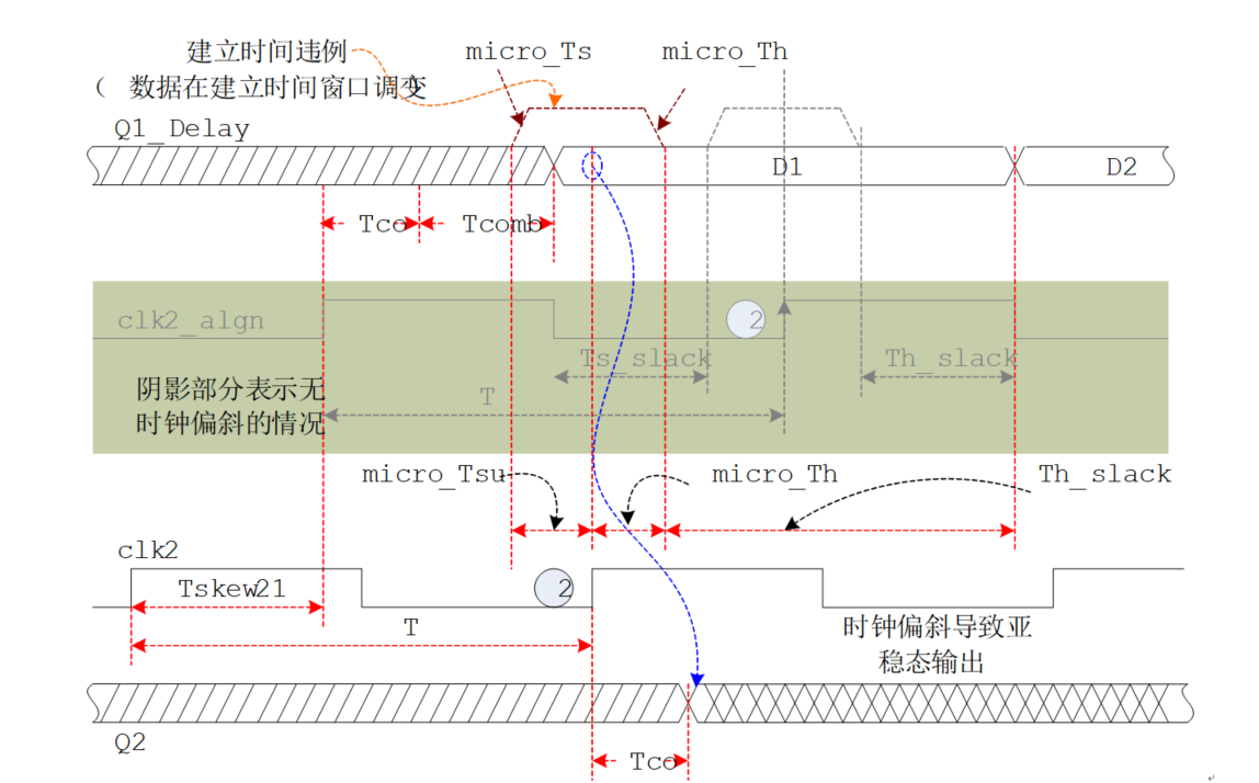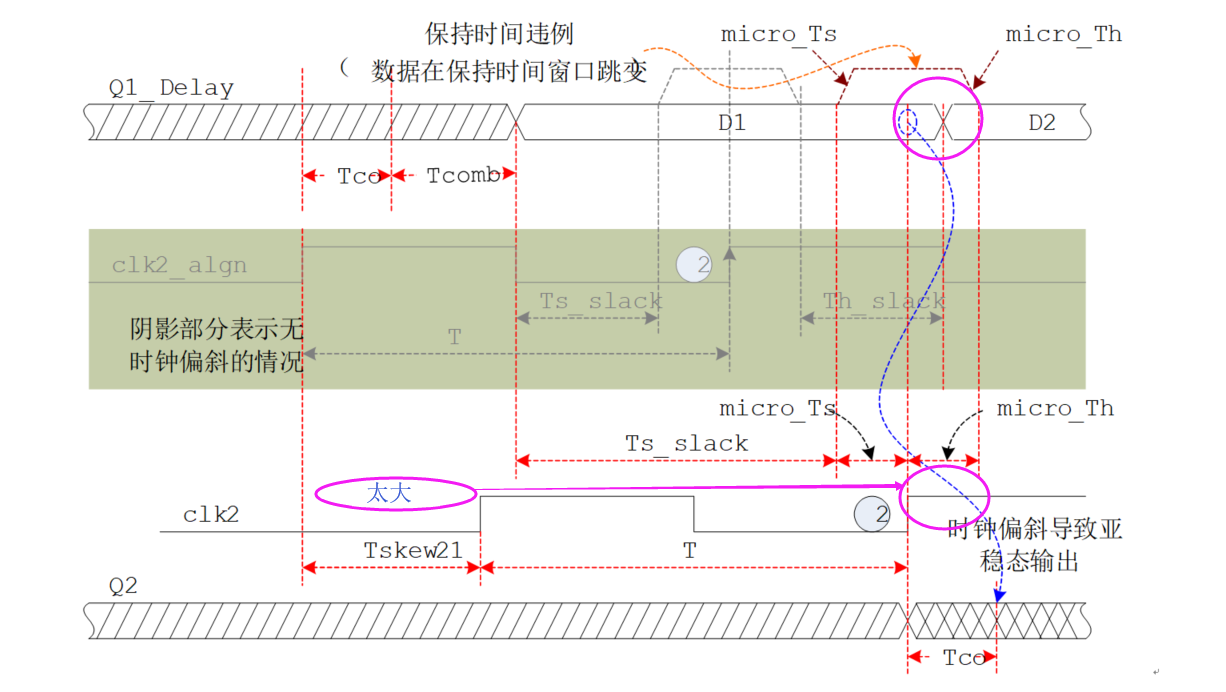 当引入的 Tskew21不够大时,没有超过保持时间裕量问题不大,但如果Tskew21太大,Tskew21>Tco+Tcomb-Th=Th-slack(未引入偏移时的裕量),就不再满足保持时间的要求,也会导致输出亚稳态。如下图所示;