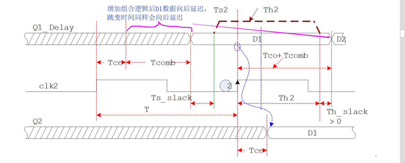 (1) Tco+Tcomb将导致数据会延迟到达下一个触发器,要想数据到达下一个触发器时满足建立时间的要求,则必要条件为: