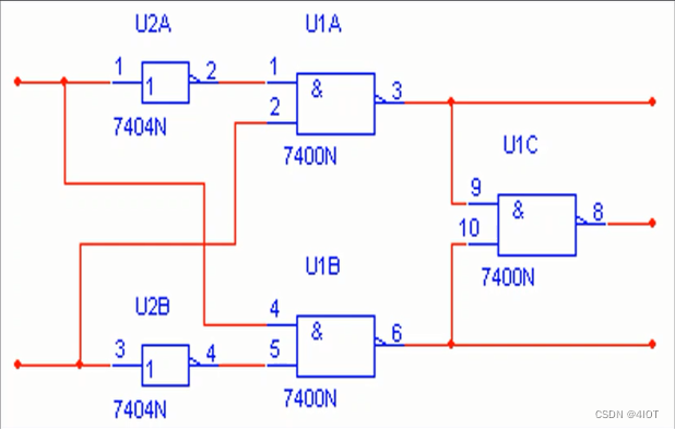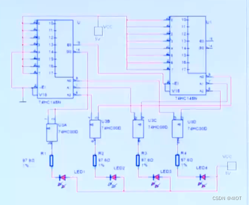 左边芯片代表优先级高的,右边芯片代表优先级低的。通过左边的状态输出引脚E0(S0)控制右边输入引脚Ei上面,低电平有效。并通过Gs脚区分当前芯片是否使能,驱动左边的高位,再通过右边的芯片控制其他3位,最终实现4个二极管的编码。