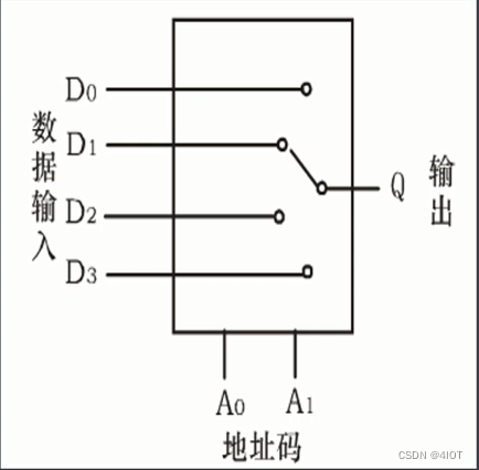 数据选择器又叫“多路开关”。数据选择器在地址码(或叫选择控制)电位的控制下,从几个数据输入中选择一个并将其送到一个公共的输出端。数据选择器的功能类似一个多掷开关,如图所示,图中有四路数据DO~D3,通过选择控制信号A1、A0(地址码)从四路数据中选中某一路数据送至输出端Q。