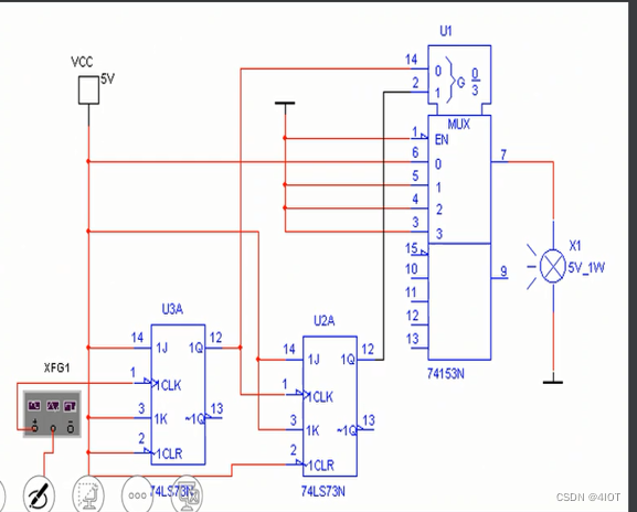 用数据选择器74153(双4选1)和J-K触发器7470组成的4通道顺序选择器电路触发器组成的计数器对时钟脉冲CP计数,周而复使地进行00到11的计数,其输出使74153顺序将1D0~1D3选中,输出端7脚依次按位得到数据输出ID0~ID3,1CLR端可对计数器清零。