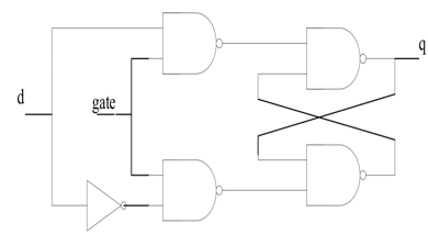 | Module latch(d,gate,q); Input d, gate; Output q; Wire d,gate; Reg q; Always @ (d or gate) If(gate) q <= d ; endmodule | |