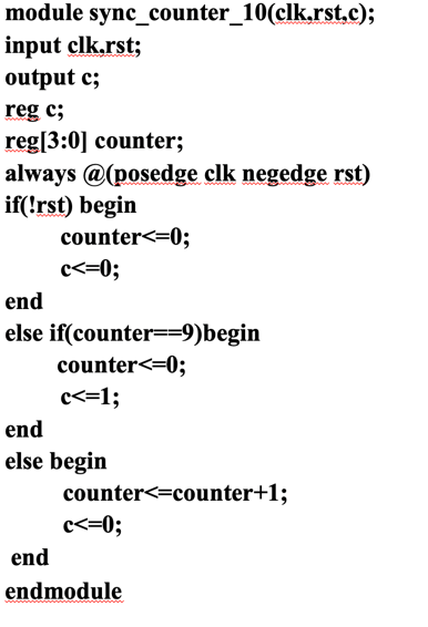 计数器一般完成计数、定时、时钟分频和某些时序控制信号的生成,同步计数器最简单、直观的描述方式是用“+”或“-”常数的算术操作,最终对用的硬件由加法器(或减法器逻辑)和寄存器实现。