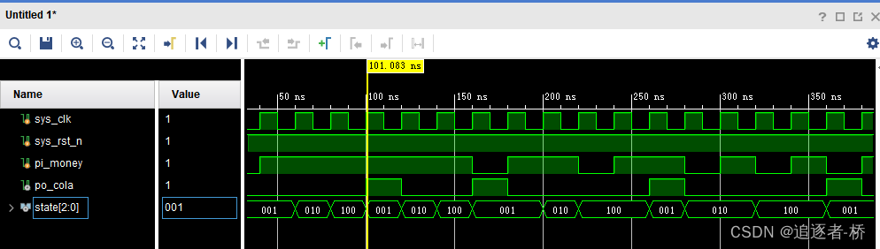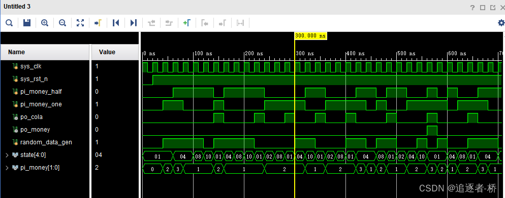 $monitor("@time %t:pi_money=%b, state=%b, po_cola=%b",$time, pi_money, state, po_cola);