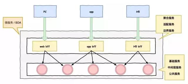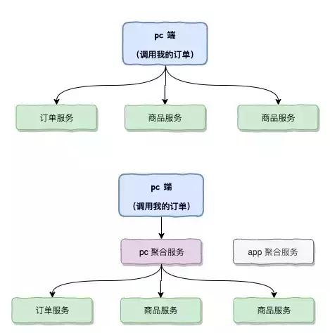 已经有了基础服务能提供业务能力,为什么还需要聚合服务,因为我们有不同的接入端,如app和H5,pc等等,它们看似调用大致相同的数据,但其实存在很多差异,例如PC需要展示更多信息,APP需要做信息裁剪等等。一般低层服务都是比较通用的,基础服务应该对外输出相对统一的服务,在抽象上做得比较好。但是对不同的外界app和pc的接入,我们需要作出不同的适配,这个时候需要有一个层去做出聚合裁剪的工作。例如一个商品详情在pc端展示和app端的展示,pc可能会展示更多的信息,而app则需要对信息作出一些裁剪,如果基础服务直接开放接口给到pc和app,那么基础服务也需要去做成各种设配,这个很不利于基础服务的抽象,所以我们在基础层之上加入聚合服务层,这个层可以针对pc和app做成适当的设配进行相应的裁剪。