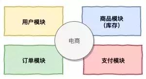用户模块,商品模块(库存),订单模块,支付模块