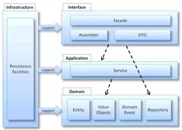 参考DDD的设计,DDD官方的架构草图,总体架构分为四层,Infrastructure(基础实施层),Domain(领域层),Application(应用层),Interfaces(表示层,也叫用户界面层或是接口层)