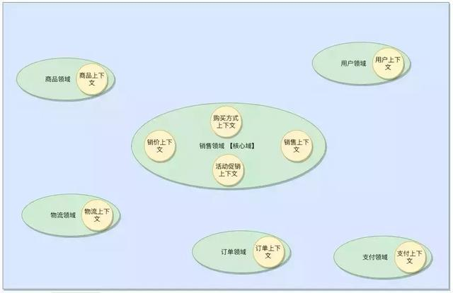 初步我们可以看出围绕销售核心域的包含的几大块内容,价格,销售方式,购买的方式,已经购买。然后我们对支撑着核心域的子域也做了划分,支撑着核心域的有商品域,用户域,通用域有订单域,物流域,支付域。