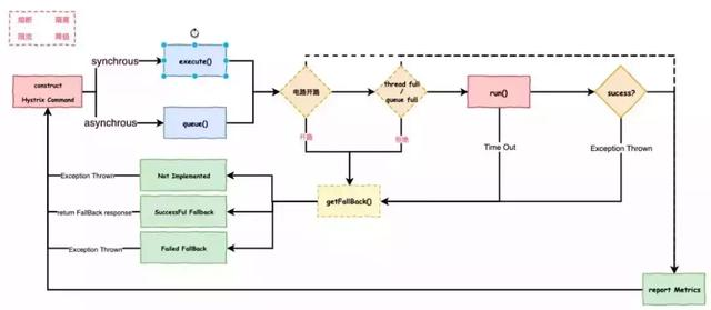 hystrix就把上面说的 熔断,隔离,限流,降级封装在这么一个组件里面 下图是hystrix内部设计和调用流程