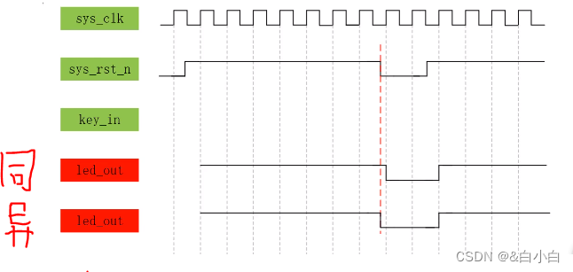 同步复位输出信号led_out不会因为复位信号sys_rst_n拉低了就立刻拉低,只有在时钟信号sys_clk上升沿检测到复位信号拉低了才会拉低,复位信号拉高时只有在时钟信号上升沿输出信号才会拉高。