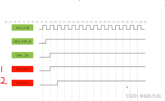 组合逻辑时,时钟上升沿采集到的输入信号key_in的高电平,那么输出信号就是高电平。高时序逻辑时,时钟上升沿与输入信号对齐,默认当前时钟沿采集到的数据是在该时钟上升沿前一时刻的值,如图时钟上升沿前一时刻key_in为低电平,所以2为低电平 ,前一时刻key_in为高电平,所以2为高电平。(延迟一拍)