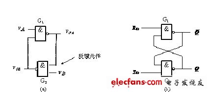 ),门G1和G2的组成有对称性, G1的输出经过G2的传输后回送到G1的另一个输入端,G2的输出经过G1的传输后回送到G2的另一个输入端,正是有了这样的反馈通道才使其具有了存储特性,也有别于前面所讲到的组合逻辑电路。通常将它们的电路结构画成图5.2.1(b)的形式,与