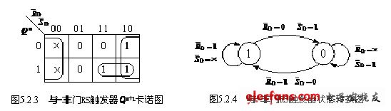 图5.2.4为与-非门RS触发器状态转换图,图中“×”在此表示任意项,它用图形的方式描述了触发器状态间的转换情况。图5.2.5为与-非门RS触发器的逻辑符号。
