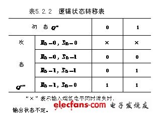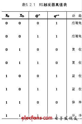 对于RS触发器输入和输出的逻辑关系,可以通过逻辑状态转移真值表来加以描述。如表5.2.1所示,真值表中考虑了触发器在