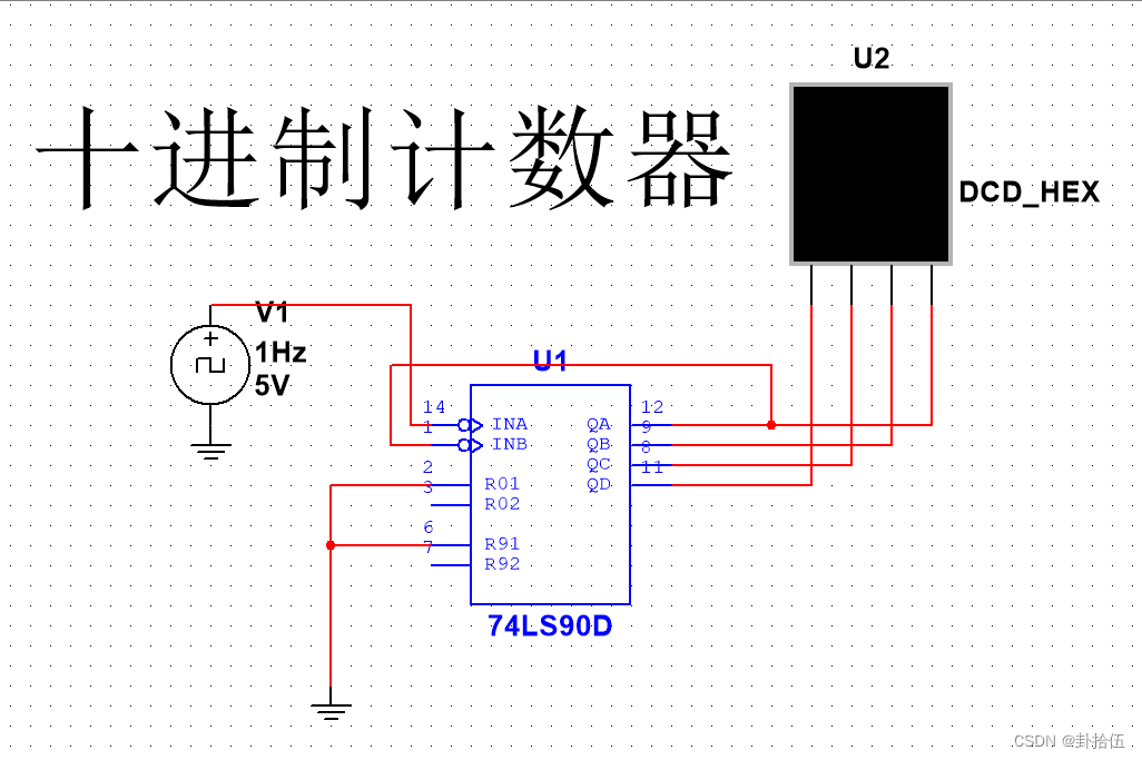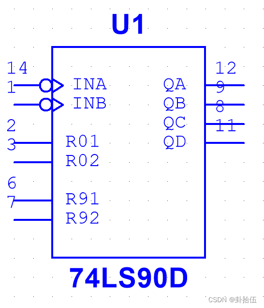R0(1)和RO(2)是异步清零端,两个同时为高电平有效;R9(1)和R9(2)是置9端,两个同时为高电平时,QDQCQBQA=1001; 正常计数时,必须保证RO(1)和R0(2)中至少有一个接低电平,R9(1)和R9(2)中至少一个接低电平,如果把QA和INB连接起来连接起来,INB从QA取信号,外部时钟信号接到INA上,那么时钟信号INA和QA、QB、QC、QD就组成了一个十进制计数器。