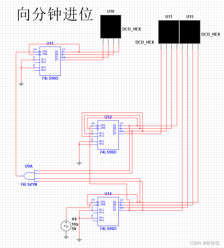 计时电路的个位时钟来自秒、分电路产生的59分59秒两个信号相与的结果;计秒电路与计分电路在计数到59时,十位状态均为QDQCQBQA=0101,个位状态均为QDQCQBQA=1001.将计秒电路中的四个1相与,计分电路中的四个1相与,两个结果再次相与,作为进时信号,从而实现向小时进位。