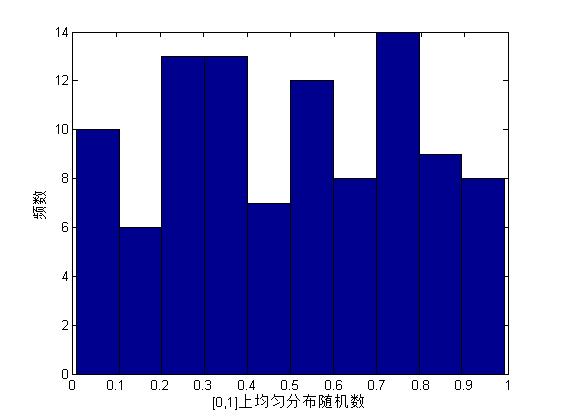 例:调用rand函数生成10x10的随机数矩阵,并将随机数矩阵按列拉长,然后调用hist函数画出频数直方图。