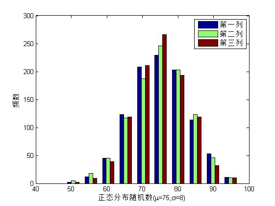 调用normrnd函数生成1000x3的正态分布随机函数,其中均值u=75,标准差为8,并画出各列频数直方图