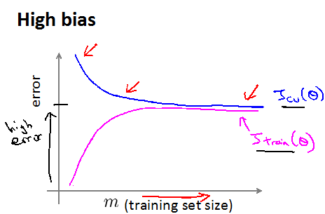 如果一个学习算法处于高偏差(欠拟合),则增大训练集的个数不会有什么帮助,训练集和验证集的J都会很大,见下图(最后随着m增大,曲线已经变成水平):(所以不是只要增大训练集就可以!)
